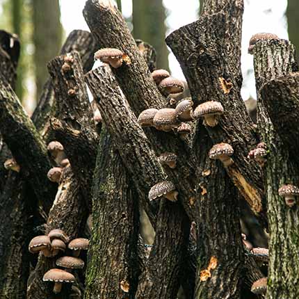 原田山業が手掛ける昔ながらの「原木栽培」はその名の通り山から伐りだした原木に植菌しキノコを生やしていく自然栽培です。