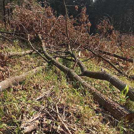 伐採後は、葉がついた状態で切り倒したまま山で2~3カ月放置します。