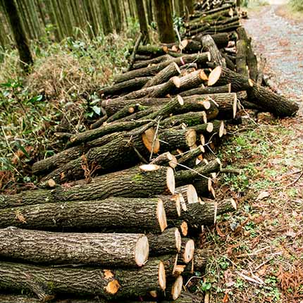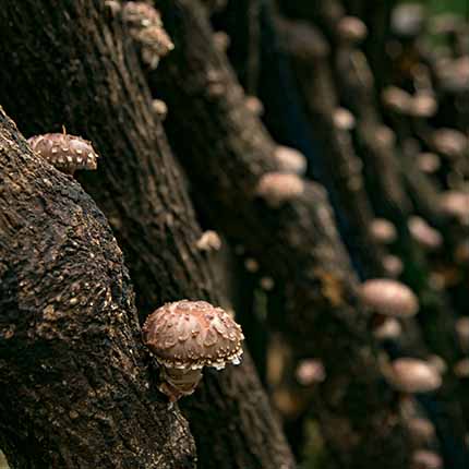原田山業が手掛ける昔ながらの「原木栽培」はその名の通り山から伐りだした原木に植菌しキノコを生やしていく自然栽培です。